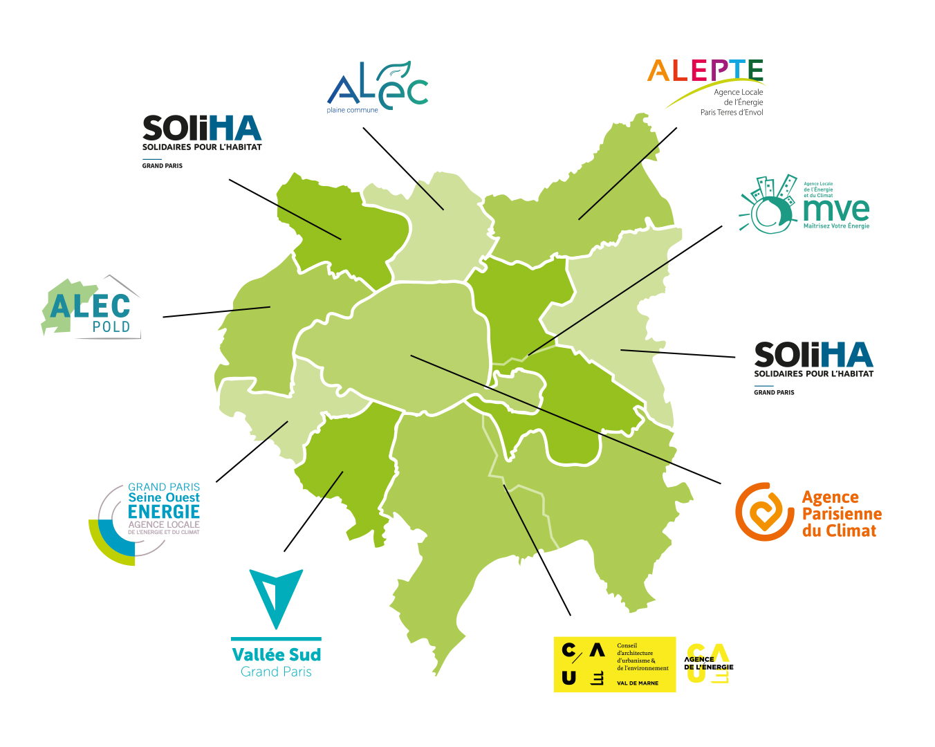 Pour la Métropole du Grand Paris, 8 structures membres du réseau national des espaces conseil France Rénov' sont réparties sur le territoire métropolitain et leurs actions se déploient géographiquement sur leurs secteurs respectifs. : l’Agence Locale de l’Énergie et du Climat de Grand Paris Seine Ouest (ALEC GPSOE), l’Agence Locale de l’Energie de l’Est Parisien (ALEC MVE), l’Agence Locale de l’Energie de Paris Terres d’Envol (ALEPTE), l’Agence Locale de l’Energie et du Climat de Plaine Commune (ALEC Plaine Commune), l’ALEC de Paris Ouest la Défense (ALEC POLD), l’Agence Parisienne du Climat (APC), le Conseil d’architecture, d’urbanisme et de l’environnement du Val-de-Marne (CAUE94) et Solidaires pour l’Habitat Grand Paris (SOLIHA). Leurs actions se déploient géographiquement sur leurs secteurs respectifs.