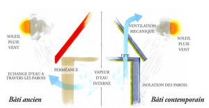 Les maçonneries d’avant 1948, qu’on appelle le bâti ancien, sont faites en matériaux perspirants de type pierres, briques pleines ou creuses, ou structure de bois et remplissages et plâtres.  Elles demandent une attention spécifique pour assurer une compatibilité dans la gestion de la vapeur d’eau et de l’eau.
