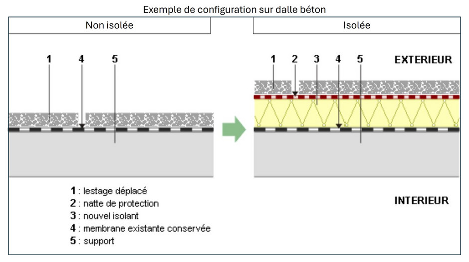 Cet isolant sera le plus souvent du polyuréthane, mais des complexes existent aussi à base de fibre de bois. Dans tous les cas, la dalle en béton devra être isolée par l’extérieur, pour donner ce qu’on appelle une « toiture chaude ».